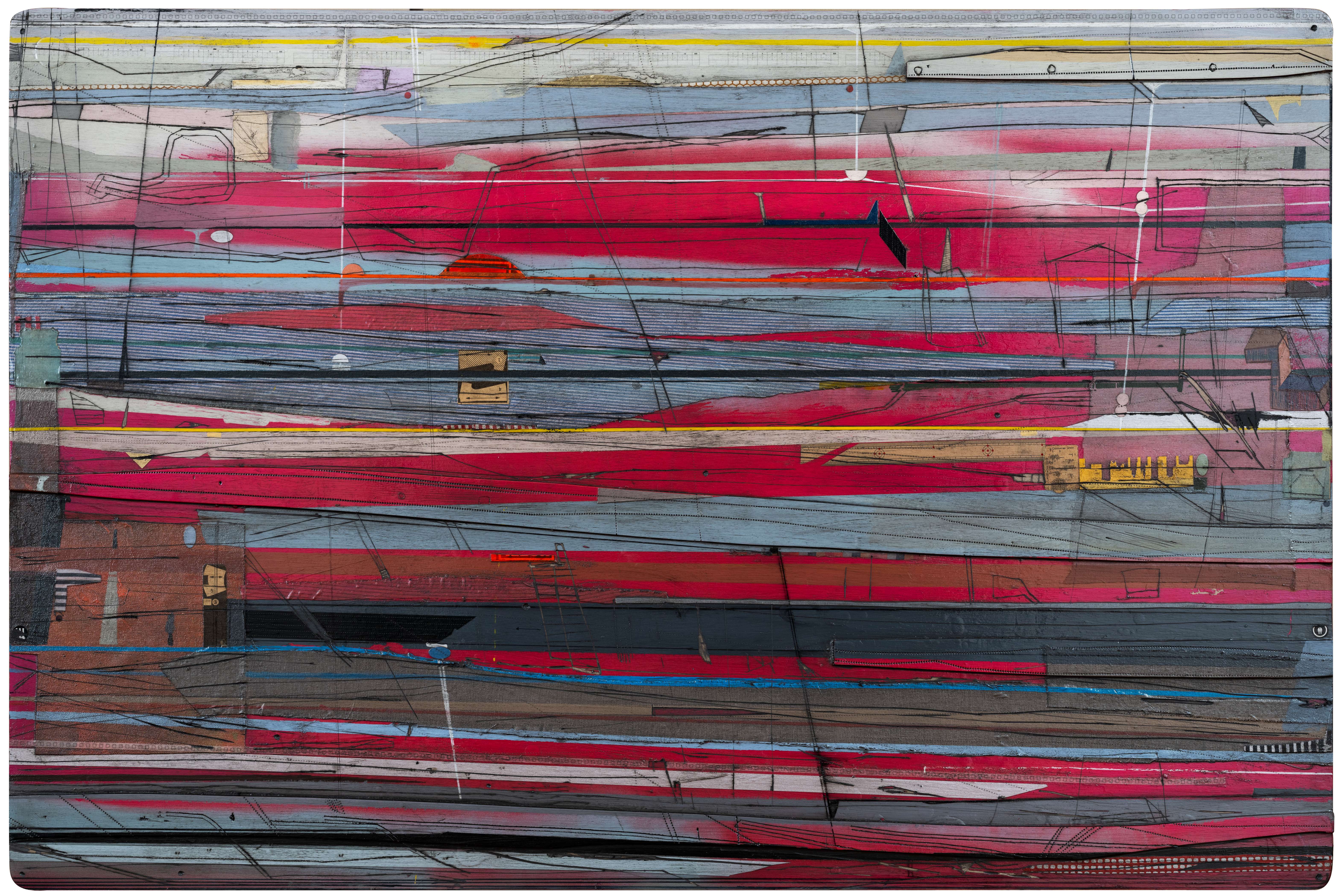 Crosswise View in room ⛶ Zoom In Mekhala Bahl Crosswise Oil, Etching, Ink, Acrylic, Collage & Wood Polymer Composite 32 x 48 inches 2024 Share